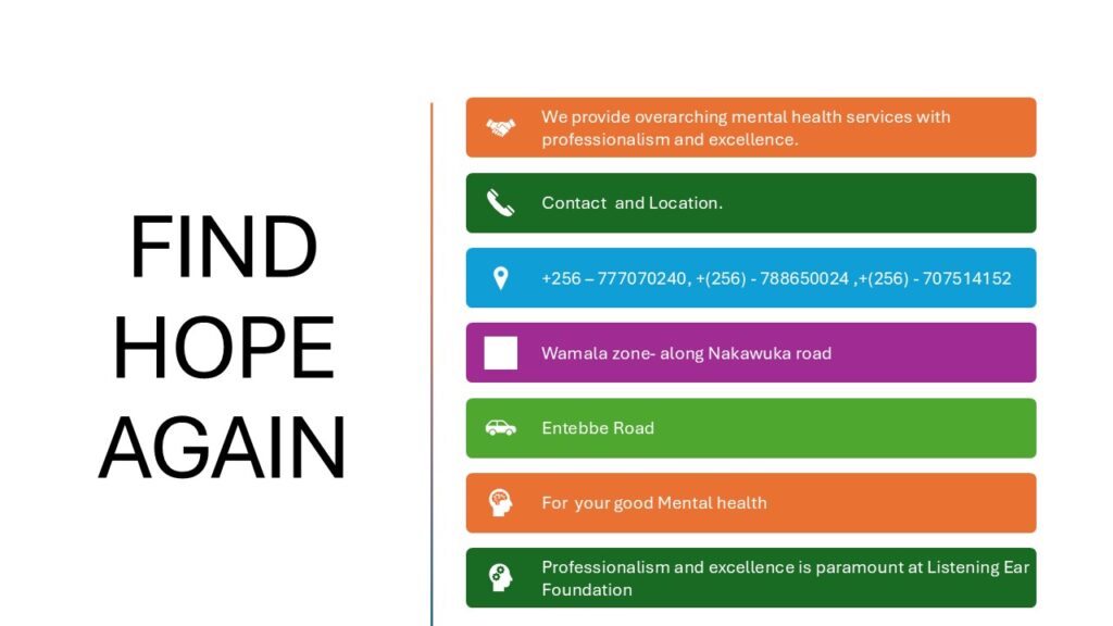 Listening Ear is a Rehabilitation Centre that provides holistic (a bio psycho social Spiritual model) services to clients suffereing from substance and drug addictions to improve their biological, psychological, mental, social, spiritual, economic and health status through screening, assessing, detoxifying, counselling, training and rehabilitating them. Located at Victoria View Estate Wamala Ssisa off Kawuku – Entebbe road, Kampala Uganda
